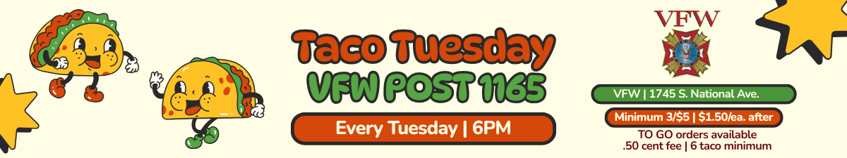 VFW Post 1165 invites the community to join them every Tuesday, starting October 7th, 2025 at 6 PM for Taco Tuesday, the tastiest day of the week! Located at 1745 S. National Ave., this weekly event features affordable tacos—just 3 for $5 and $1.50 each after. To-go orders are welcome with a $0.50 fee and a 6 taco minimum. It's a fun, flavorful way to support your local VFW and enjoy a great meal!